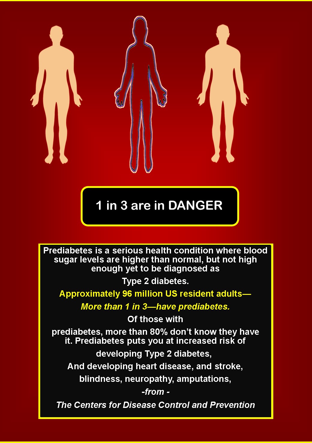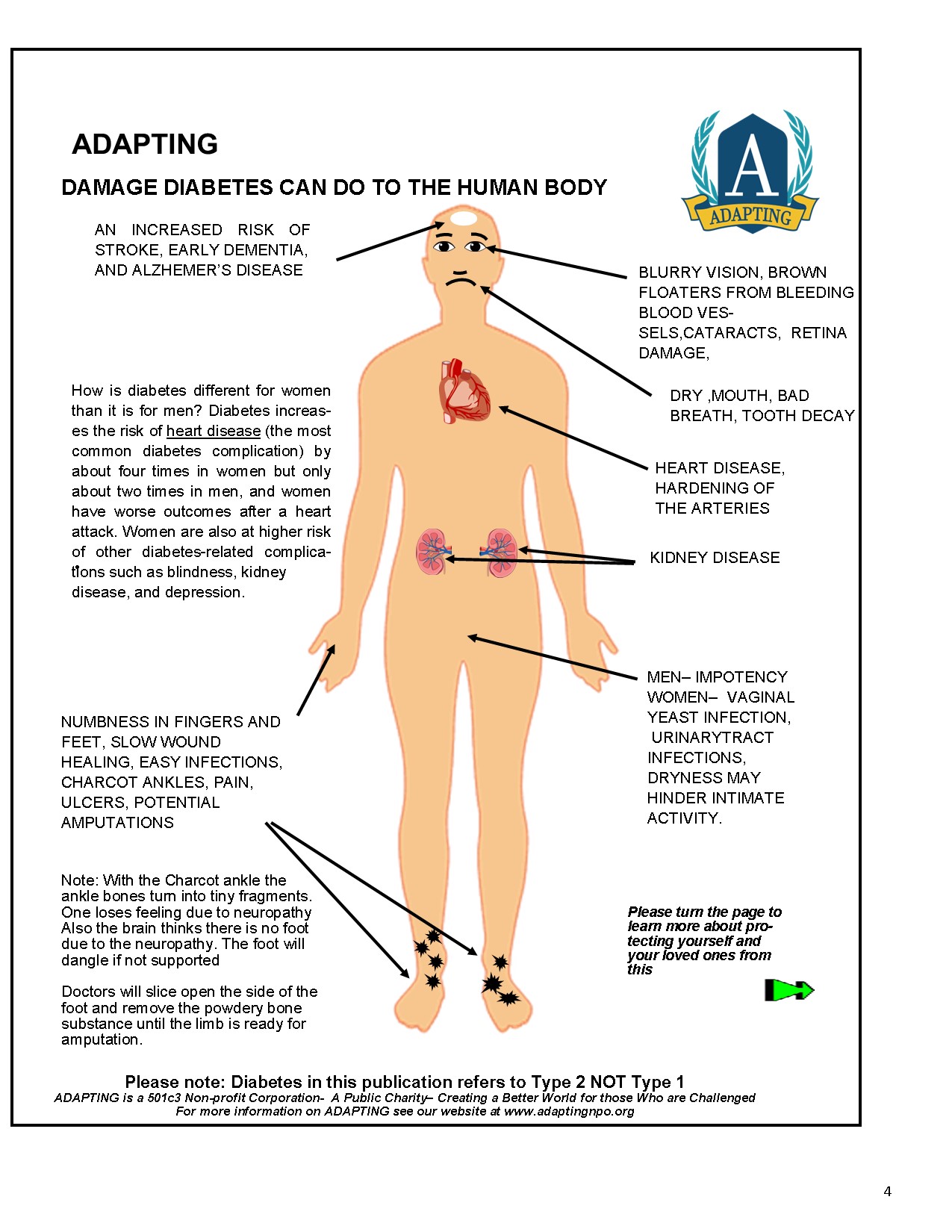 DIABETES IN THIS COUNTRY IS AN EPIDEMIC IN OUR CHILDREN according to the United States Center for Disease Control and Prevention. Diabetes is a silent killer that can cause blindness, heart disease, kidney disease, amputation, loss of limb use, nerve damage and death for those who do not recognize its' symptoms and take action. ADAPTING HAS CHOSEN TO FIGHT THIS DISEASE IN CHILDREN THROUGH EDUCATION FIRST WITH A SYSTEMATIC APPROACH UTILIZING A BROAD SPECTRUM OF COMMUNICATION VEHICLES IN EDUCATION. WE WILL START WITH THE CHILDREN AND THEN WITH THE PARENTS AND OTHER RELATIVES- Remember, what Abe Lincoln said, " If you teach the children you do not need to teach the adults.?" The ADAPTING approach will teach both together through various communication vehicles. WE SHOW OTHERS HOW TO PREVENT THIS HORRIBLE DISEASE THROUGH RECOGNIZING ITS' SYMPTOMS AND KNOWING HOW TO AVOID TYPE 2 DIABETES WHEN POSSIBLE.