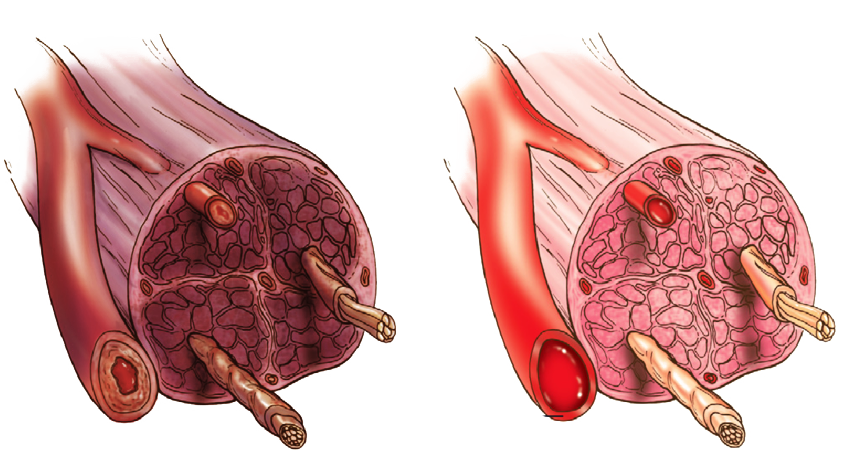 ABOVE NEUROPATHY A DIABETIC CONDITION CAUSED BY NERVE DAMAGE THAT NORMALLY RESULTS IN AMPUTATION IF NOT TREATED. THE LEFT SIDE IS DAMAGED AND THE RIGHT SIDE IS HEALTHY NOTE HOW THICK THE BLOOD VESSELS AND NERVES BECOME (THE UNHEALTHY LEFT PHOTO) PLEASE NOTE THE LEFT SIDE IS DYING